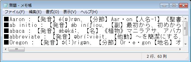 ![]() ↑通常データの場合 ![]() ↑PDIC *.DICデータの場合 ![]() ↑鍋田辞書で英辞郎のPDICの*.DICファイルからUnicodeテキストに出力したテキストをWINDOWS付属のエディタのメモ帳で見た例。 メニューの「データ」の「今の検索条件で各種形式テキストファイル出力(UTF8/SJIS/EUC)」でテキスト出力ウィンドウを開き、出力形式に「辞郎形式テキスト」を指定します。 通常の辞郎形式と互換を取る場合は、文字コードはSJIS、「改行取る」の指定が必要です。 PDIC for win32(拡張子DICのファイル)の英辞郎からの出力では、「PDIC発音記号部を出力」が必要です。 通常の辞郎形式と互換を取る場合は、「PDIC発音後変換」を「PDIC発音記号部をIPA93->辞郎形式に変換」を選択します。 発音記号を辞郎形式のSJIS代替文字ではなくUnicodeの発音記号を出力したい場合は、「PDIC発音記号変換」のところを「PDIC発音記号部をIPA93->Unicodeに変換」を選びます。 発音記号をUnicodeにする場合は、出力文字コードはUTF-8のみになります。 SJIS(シフトジス)やEUCには発音記号の文字が含まれないため代替文字しか選択肢がありません。 |